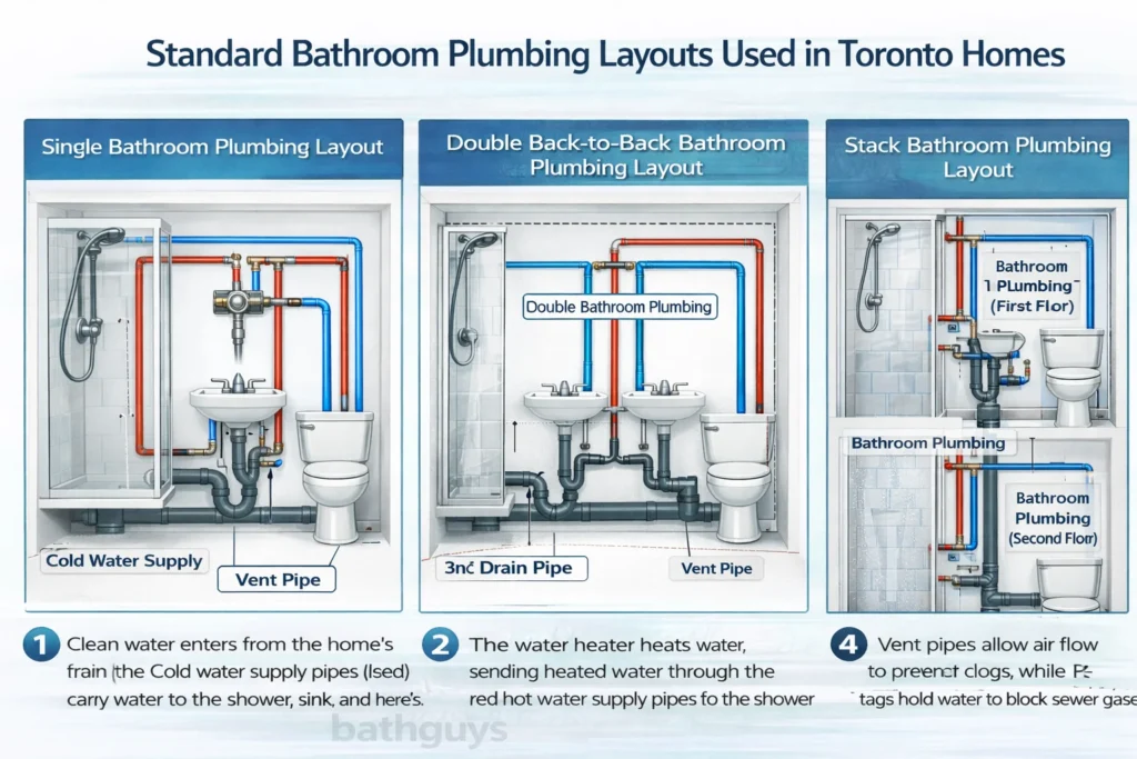 In most Toronto homes, a bathroom plumbing diagram is designed to keep fixtures close to the main drain stack. This improves drainage, reduces pipe length, and helps meet Ontario plumbing code requirements. The layout you choose affects cost, inspection approval, and how smoothly your bathroom functions.